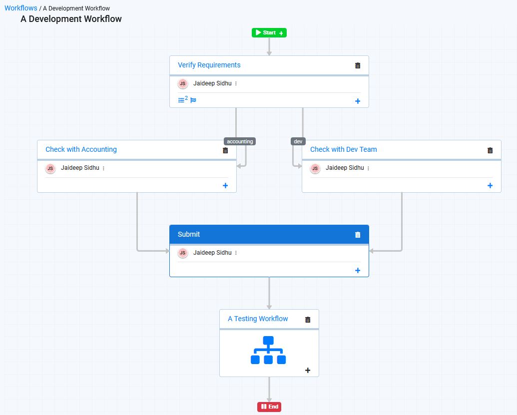 In this case, the 'Submit' task of 'A Development Workflow' calls 'A Testing Workflow'.