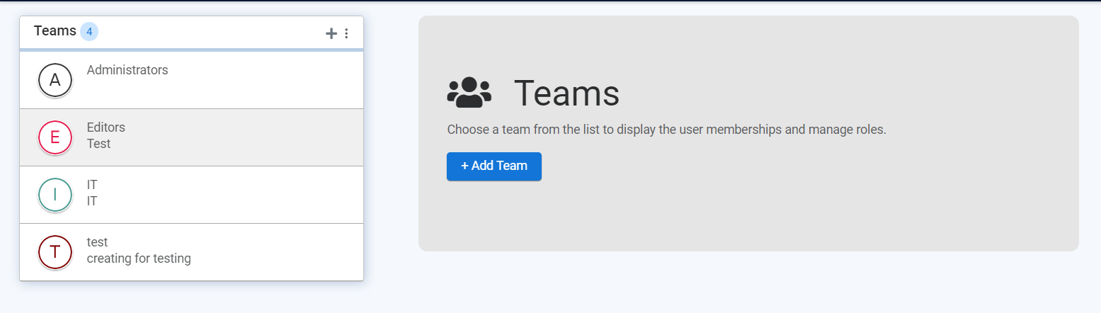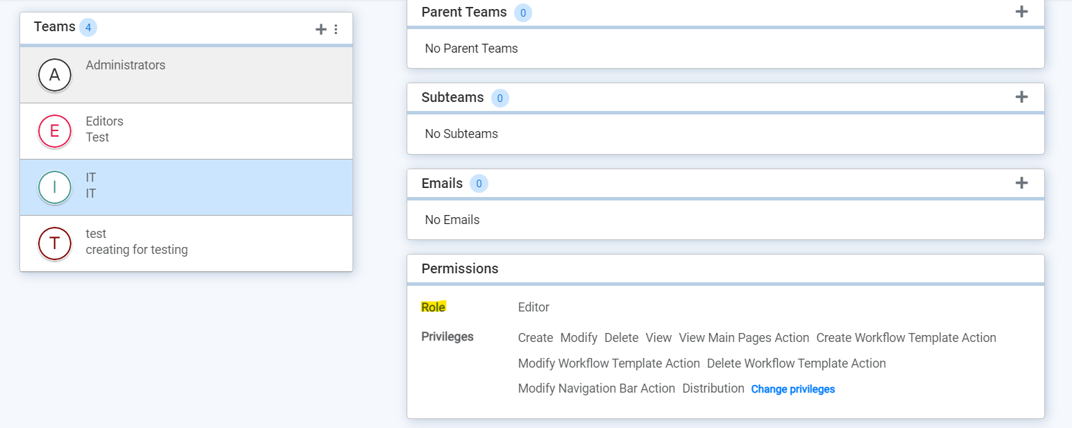 - Select a team in the Teams list. The team's current role is shown in permissions.