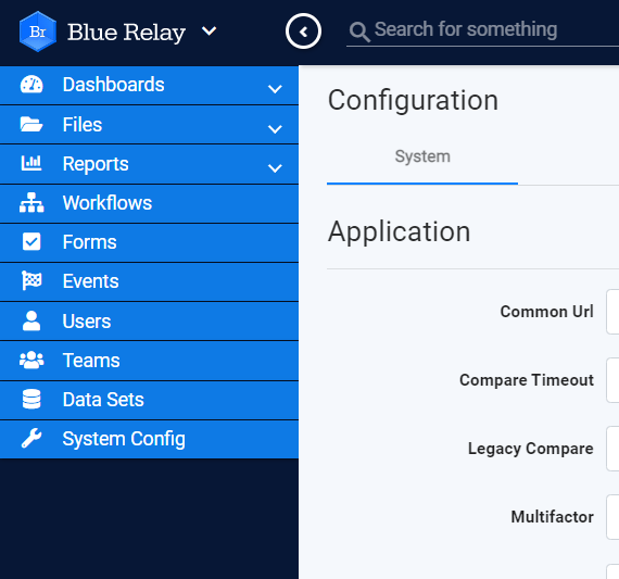 1. Open the System Config. page in Blue Relay by clicking the "System Config" button in the left navigation bar.