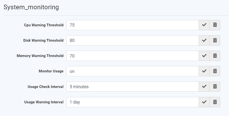 3. Define how often to check the system usage levels by setting the System_monitoring.usageCheckInterval key. By default, it's set to every 10 minutes, but you can customize it as needed.