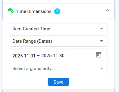 Time dimensions: Filters based on Time. If you have selected a Cube with a time field such as "Date Created", you can filter your results by a fixed date range or a relative date range. Relative date ranges are expressions such as: “10 days ago, last year, last month, last quarter, 10 business days ago”, etc.