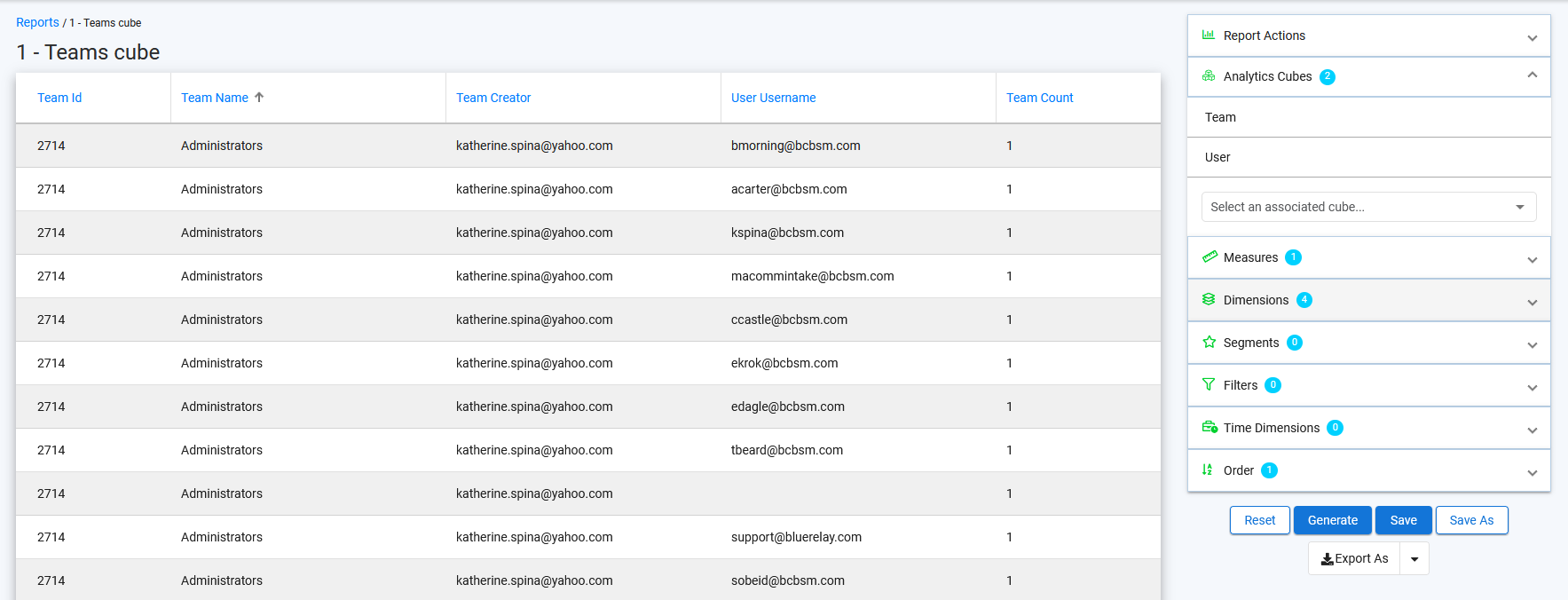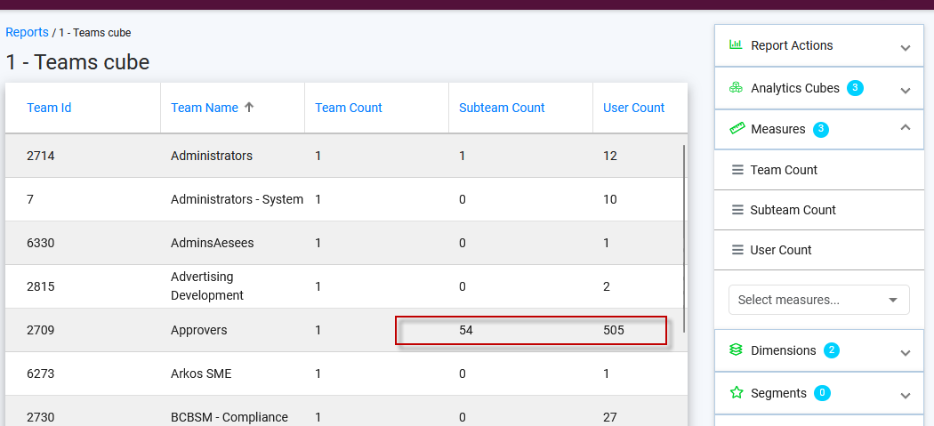 This datasource is for use with the Teams cube as it's context (the first cube to select when building the report). You may pull in columns to see subteam names, or simply the Count Measures for roll-up sums.