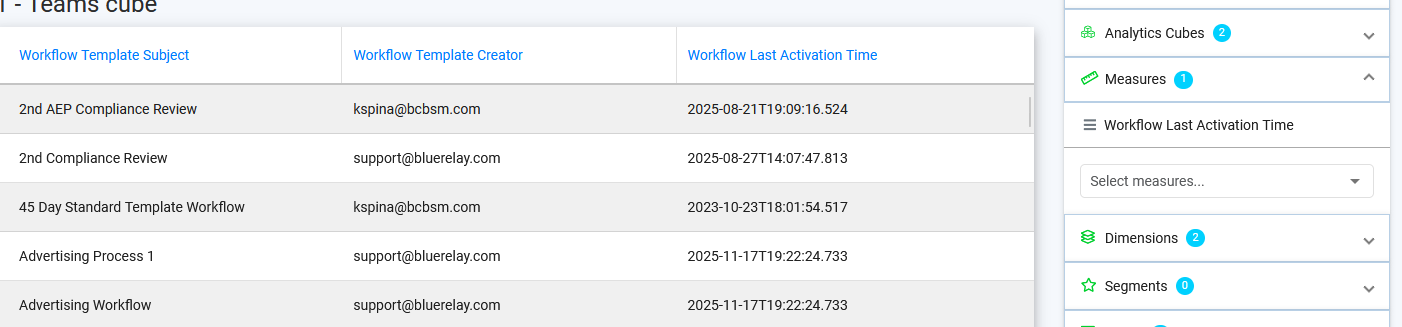 | Last Activation Time | Timestamp of the last time the Workflow was activated. Useful with Workflow Template cube in context. |